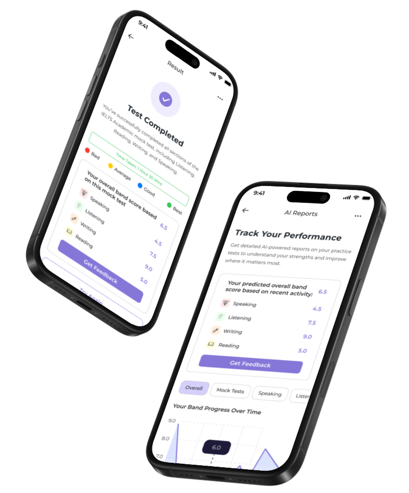 From daily practice to full IELTS mock tests - Everything you need at your fingertips. Our platform provides AI powered IELTS practice for all four modules with instant feedback, band prediction, and progress tracking.